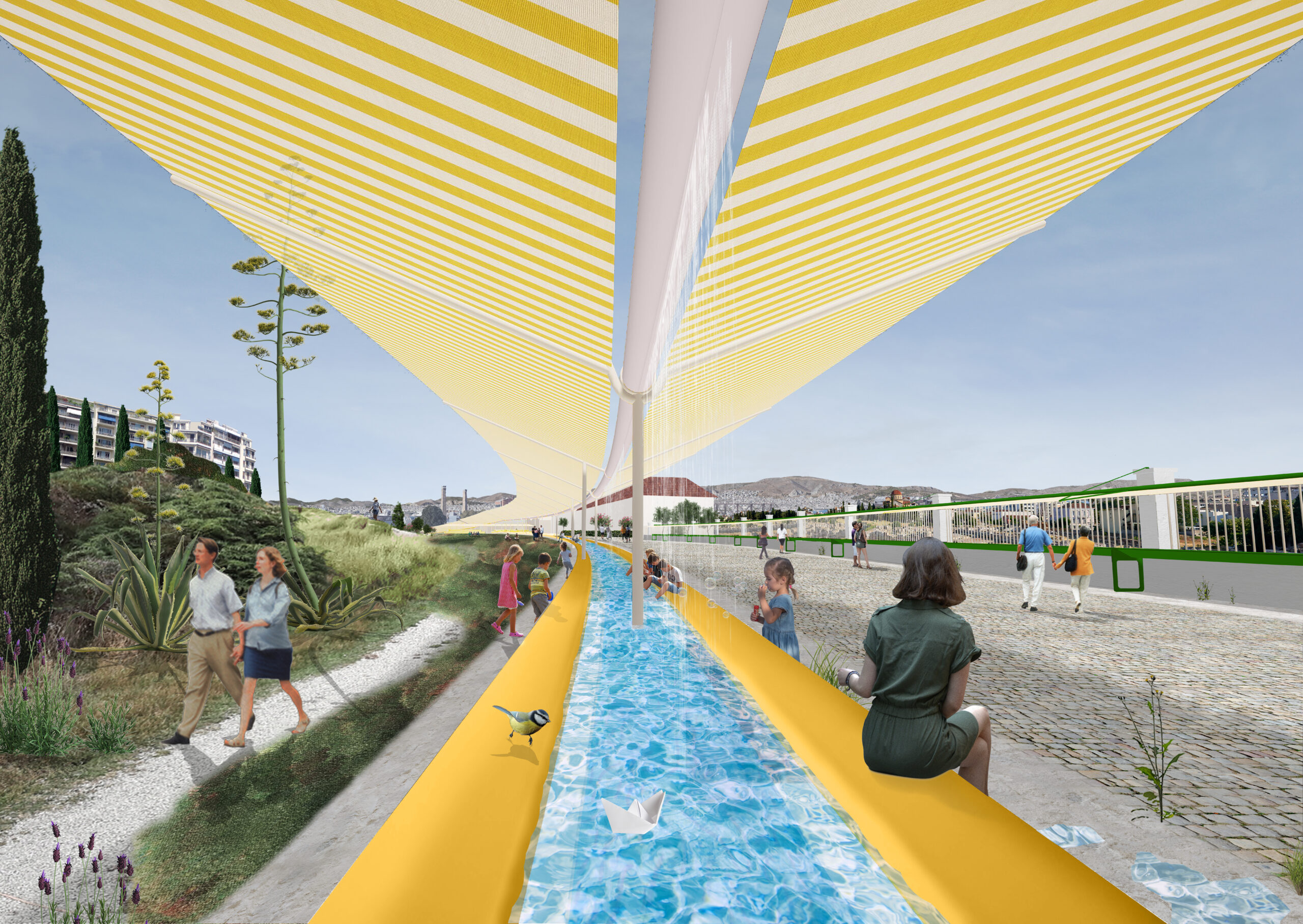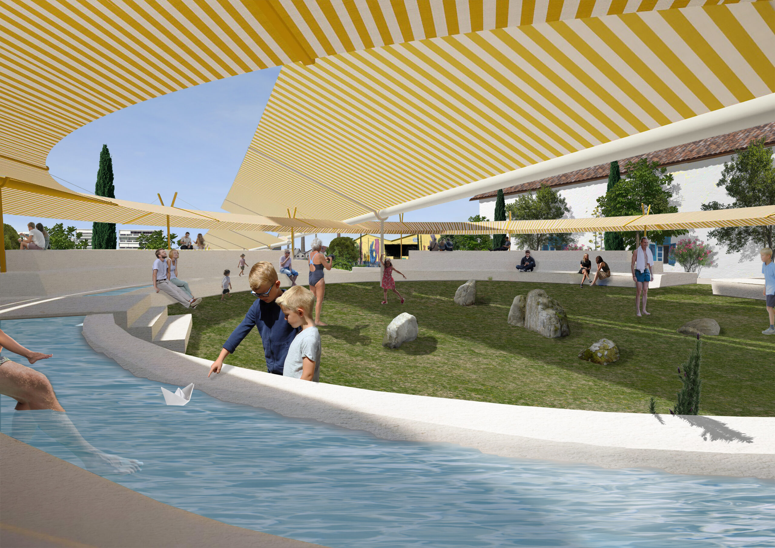 The project combines climate adaptation, landscape design, and spatial experience, transforming the park into a sequence of cool, shaded, and active public spaces during the hottest periods of the year.