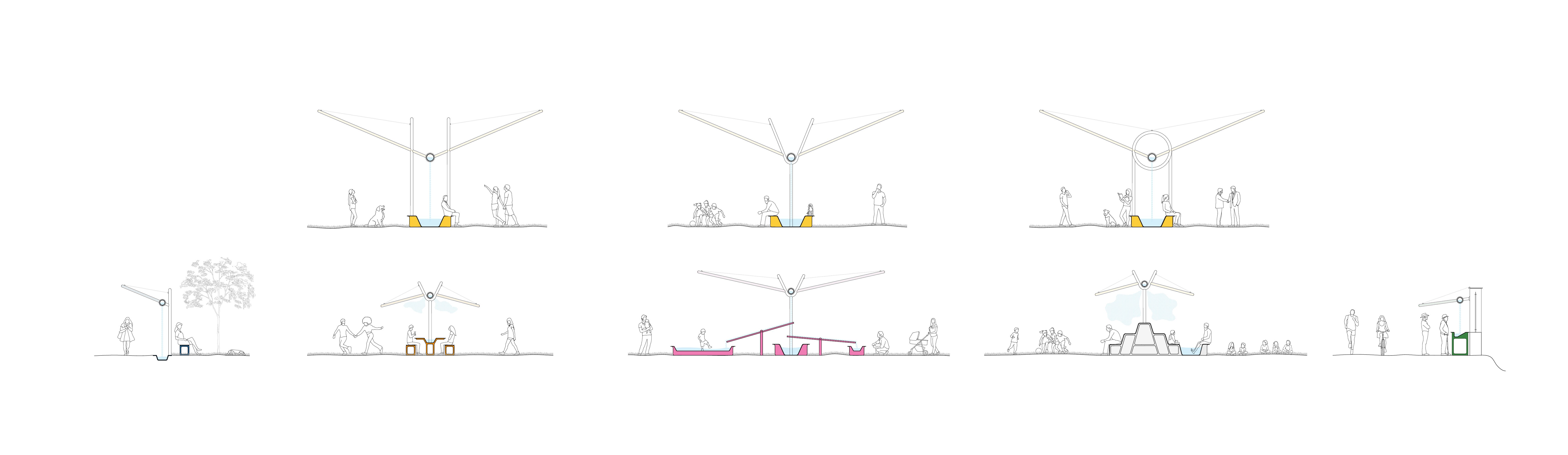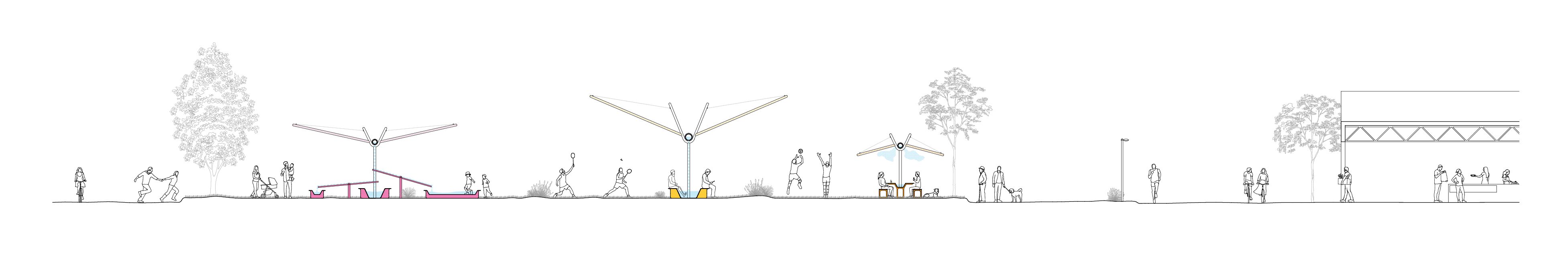 The proposal introduces a large arching water system that runs through the park, punctuated by a series of stations differentiated by specific uses and color-coded identities. Each section functions as a small river, shaded by a lightweight mesh textile designed to capture humidity from the air. The collected moisture drips down, is guided toward a central point, and contributes to feeding the water system.